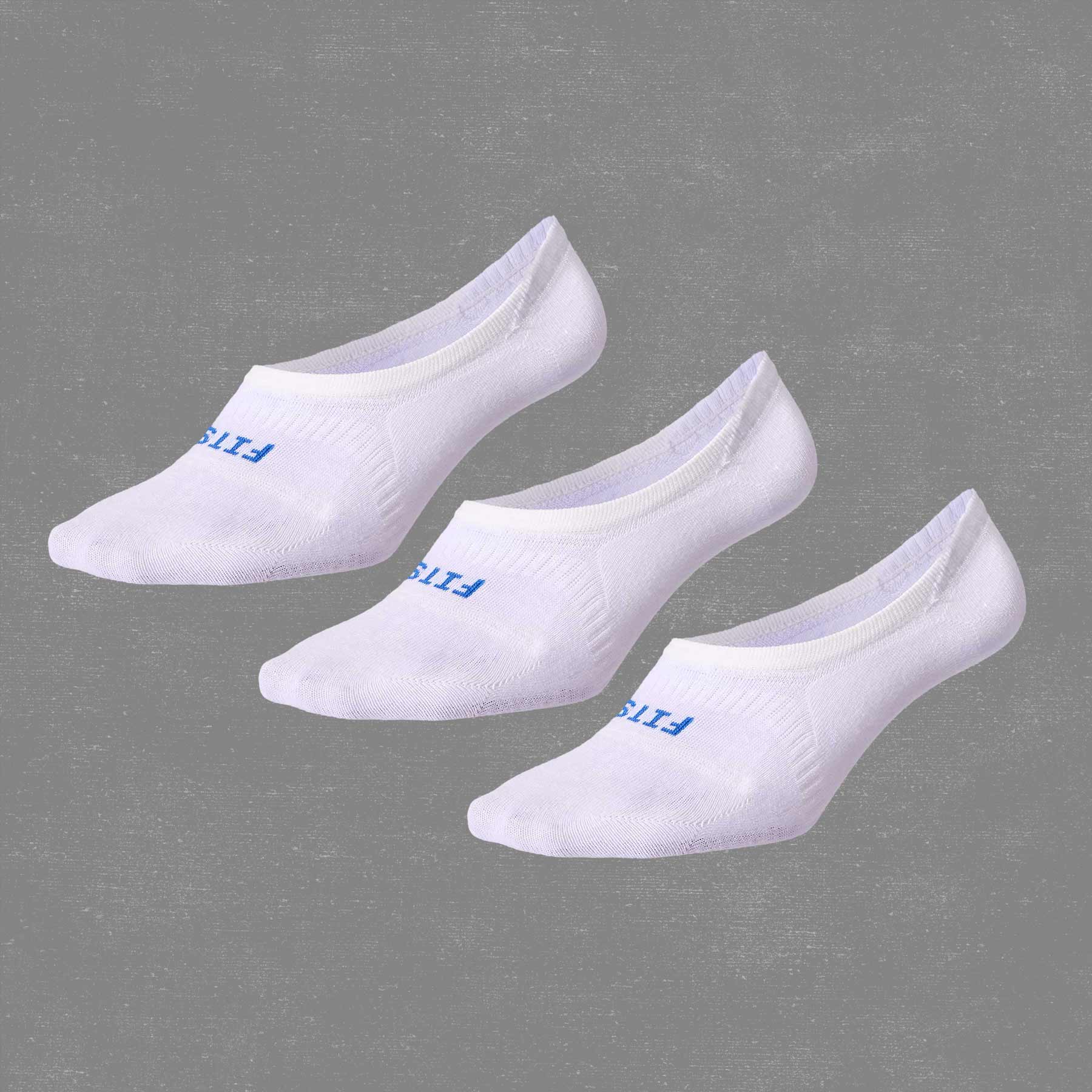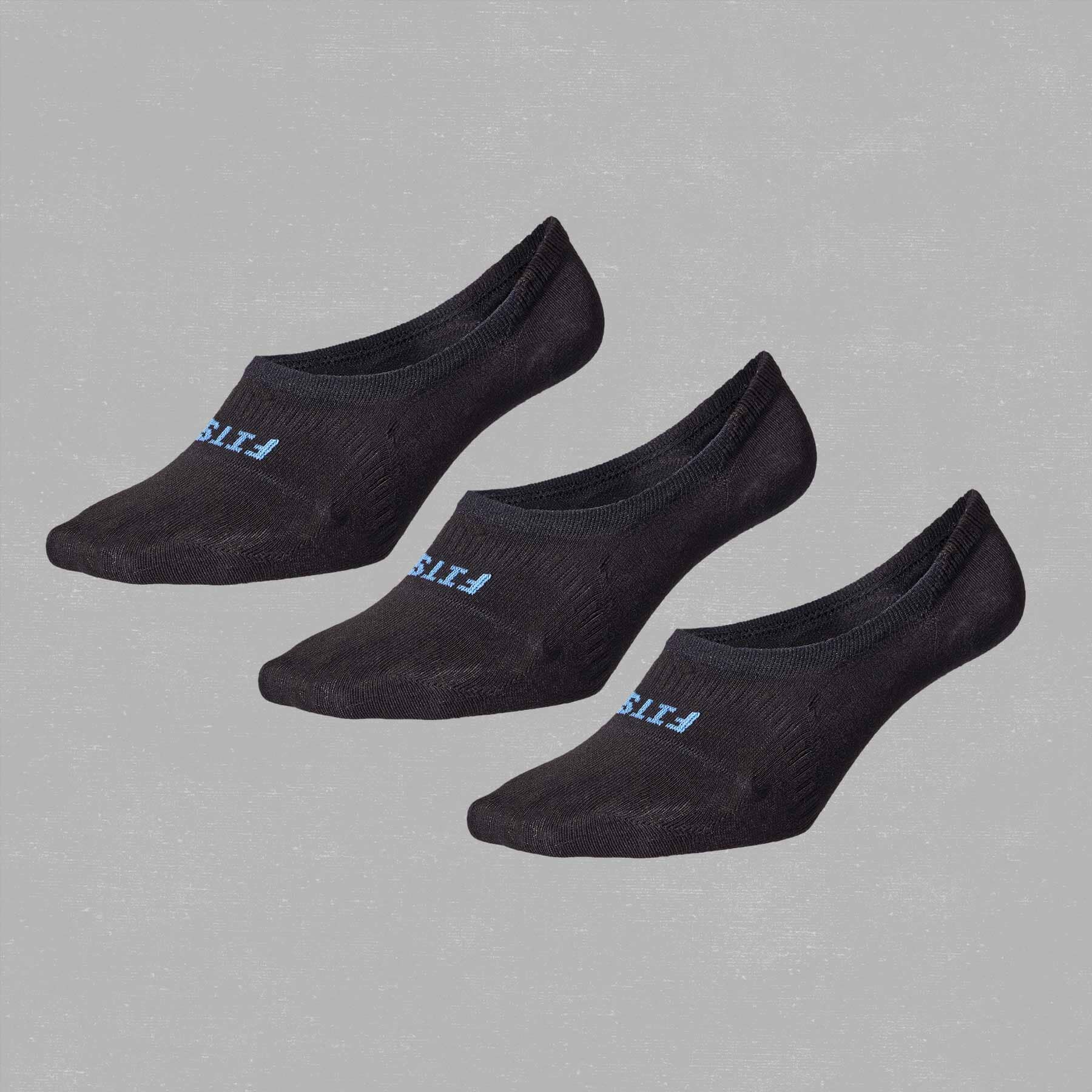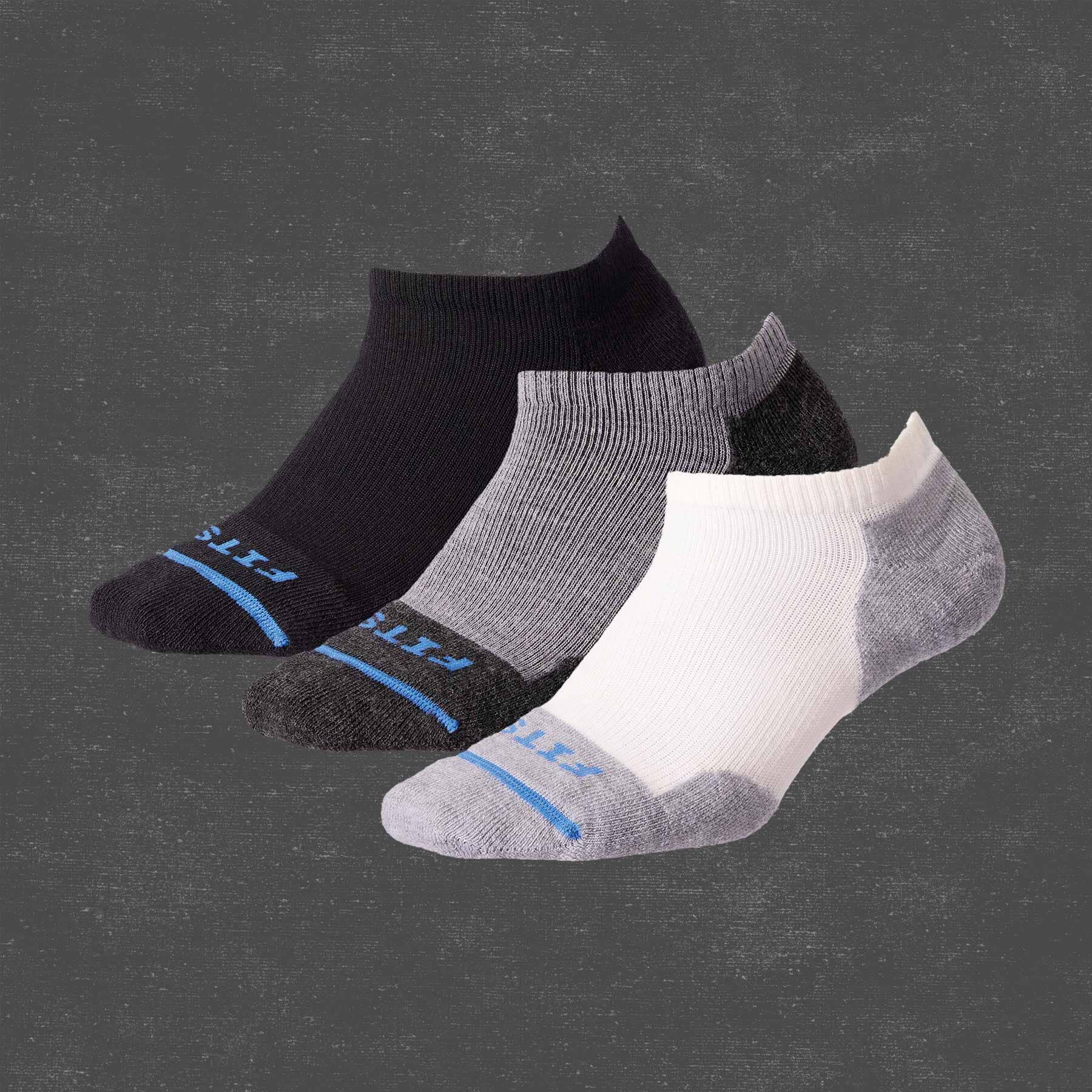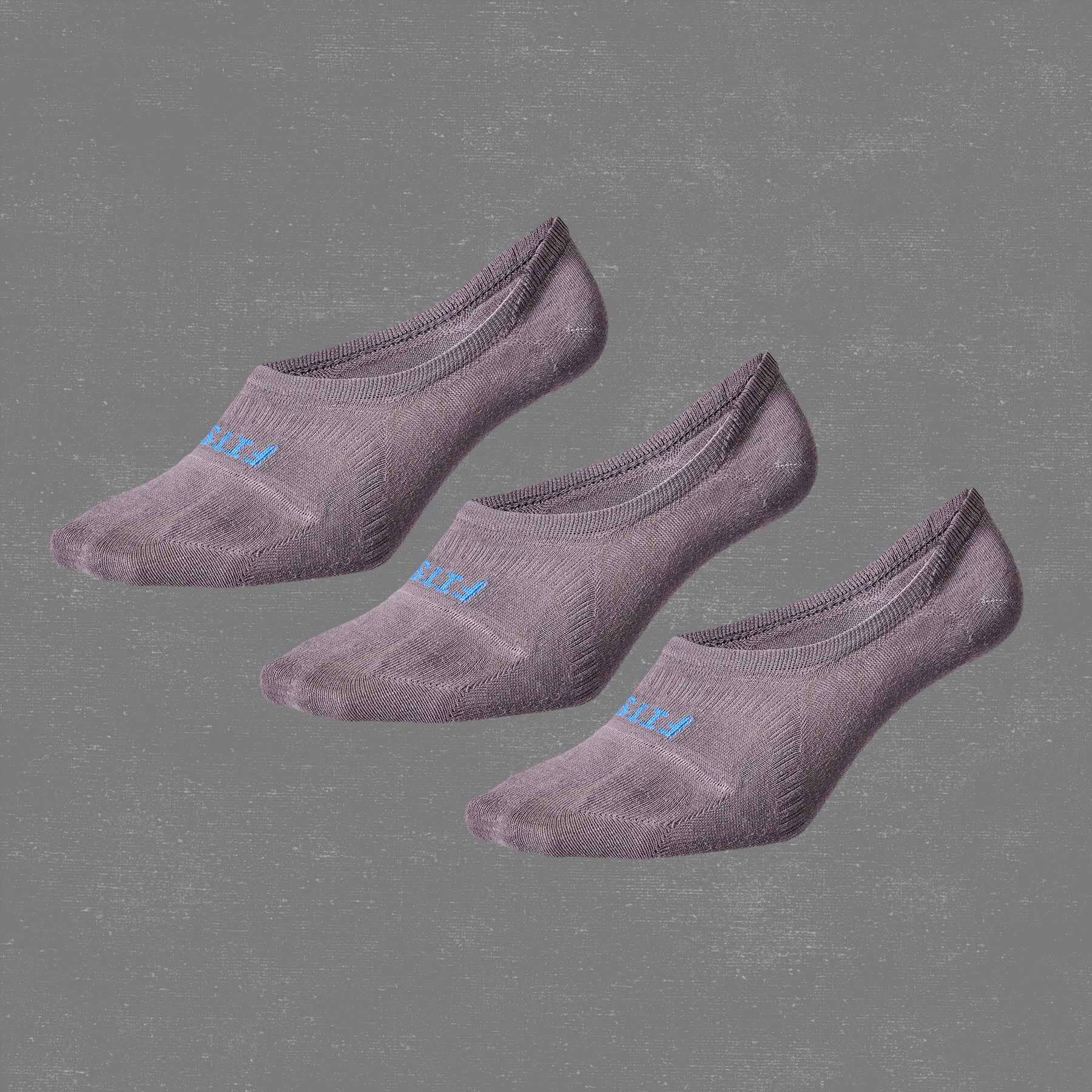 FITS® invisible socks feature a seamless, one-piece construction that keeps the sock locked in place without being seen. This wool sock pack is available in white, grey, and black.